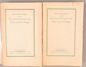 RILKE Rainer Maria RILKE Rainer Maria Die Aufzeichnungen des Malte Laurids Brigge Leipzig, Im Insel Verlag, 1910, 2 tomes In-12°, broché. Dos uniformément passés. Première édition commerciale, après 50 rares exemplaires de luxe parus un peu plutôt dans l’année. Rilke, grâce à cet unique roman dans son œuvre, a contribué, avec Proust et Kafka notamment, à faire entrer le roman dans la modernité du XXe siècle.