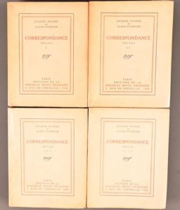 RIVIÈRE Jacques – ALAIN-FOURNIER RIVIÈRE Jacques – ALAIN-FOURNIER 1/109 RÉIMPOSÉS Correspondance 1905-1914 Paris, NRF, 1926-28, 4 tomes In-4° tellière, brochés. Non coupés. Dos assombris. Édition originale. Pour chaque tome, 1/109 réimposés sur pur fil (n°LXXVIII pour Dr Heger-Gilbert). On joint : - Alain-Fournier Lettre à « Valentine » Paris, Émile-Paul frères, coll. Les Introuvables, 1938 Édition originale rare car chaque titre de cette collection « Les Introuvables » n’a été tiré qu’à 30 exemplaires pour l’auteur et quelques amis. - Lettre d’Alain-Fournier au Petit Bichet Paris, Émile-Paul frères, coll. Les Introuvables, 1947, 2 exemplaires Édition originale rare car chaque titre de cette collection « Les Introuvables » n’a été tiré qu’à 30 exemplaires pour l’auteur et quelques amis.
