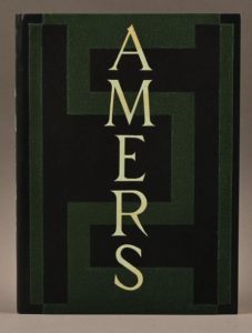 SAINT-JOHN PERSE SAINT-JOHN PERSE RELIURE DE PIERRE-LUCIEN MARTIN Amers Paris, Gallimard, NRF, 1957 In-4°. Box noir mosaïqué (P.L Martin – 1959). Dos lisse avec auteur en lettres dorées et lettres du titre mosaïquées de box blanc écru. 1er plat orné de daim vert sombre et noir formant un décor géométrique travers duquel se déclinent, à l’instar du dos, les lettres du titre mosaïquées de box blanc écru. 4e plat recouvert de daim vert sombre. Contreplats bordés de box noir et recouverts de papier vert pâle. Gardes de même papier. Tête dorée. Couv. et dos parfaitement cons. Chemise à rabats de papier vert sombre et au dos de plexi souple translucide laissant découvrir le dos de la reliure. Étui bordé de box noir et recouvert du même papier vert sombre. Petits frott. à la chemise et à l’étui. Édition en partie originale. 1/35 de tête sur Hollande (n°25). Splendide reliure de Pierre-Lucien Martin