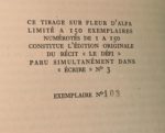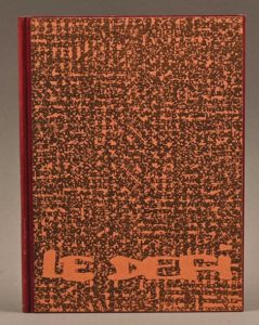SOLLERS Philippe SOLLERS Philippe RARE 1ère OEUVRE SUR GRAND PAPIER AVEC ENVOI Le Défi Paris, Seuil, Revue Écrire, 1957 In-12°. Demi maroquin marron à la bradel. Plats ornés de papier orange maculé de mots enchevêtrés les uns dans/sur les autres desquels surgissent en négatif au 1er plat le titre de l’œuvre et au 4e les prénom et nom de l’auteur. Couv. et dos parfaitement cons. Édition originale rare de la 1ère œuvre publiée de l’auteur. Tiré à part de la Revue Écrire (n°3) éditée par les Éditions du Seuil. Tirage unique à 150 exemplaires sur fleur d’Alfa (n°101). Envoi autographe signé de l’auteur. Très élégant exemplaire.