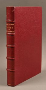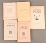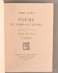 SUARÈS André – [BOURDELLE Antoine] SUARÈS André – [BOURDELLE Antoine] Poèmes du temps qui meurt Paris, Claude Aveline, 1929 In-4°. Plein maroquin lie-de-vie. Dos à 5 nerfs avec auteur, titre et date en lettres dorées. Bordures des contreplats de même maroquin ornées d’un jeu de trois filets dorés. Coiffes guillochées. Filet courant sur les coupes. Couv. et dos cons. Petits frott. au dos. Intérieur très frais. Étui. Édition originale illustrée par 20 dessins reproduits d’Antoine Bourdelle. 1/225 sur vélin, après 25 Japon. Le bulletin de souscription a été relié in-fine. On joint du même : - Cressida Paris, Émile-Paul frères, 1913 In-12°, broché. Coiffes abîmées et brochage fragile. Édition originale. Exemplaire spécialement tiré pour l’auteur (n°121) - Les Bourdons sont en fleur Paris, Émile-Paul frères, 1917 Petit in-12°, broché. Non coupé. Édition originale. 1/1600 sur vergé d’Arches. - Martyre de St Augustin Liège, Le Balancier, 1929 In-8°, broché. Édition originale. 1/350 sur Hollande. - Marsiho Paris, Grasset, 1933 In-12°, broché. Édition originale. Exemplaire sur Alfa. - Cité de Paris Paris, Grasset, 1934 In-12°, broché. Édition originale. Exemplaire sur Alfa.