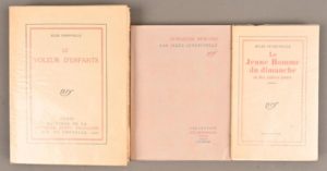 SUPERVIELLE Jules SUPERVIELLE Jules Le Voleur d’enfants Paris, NRF, 1927 In-4° tellière, broché. Dos passé et rousseurs en début de vol. Édition originale. 1/114 réimposés (n°III pour Pierre Duché) On joint du même : - Le Jeune Homme du dimanche et des autres jours Paris, Gallimard, NFR, 1955 In-12°, broché Édition originale. 1/45 exemplaires sur pur fil Lafuma, seul grand papier. - Oublieuse Mémoire Paris, Gallimard, NRF, Collection Métamorphoses, 1949 In-12° carré, broché. Édition originale. Exemplaire du service de presse. Envoi autographe signé de l’auteur. Est encarté le f. de présentation de l’œuvre.