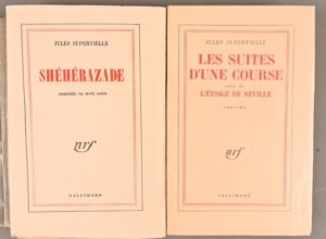 SUPERVIELLE Jules SUPERVIELLE Jules Réunion de 2 ouvrages de pièces de théâtre en tirage de tête : - Shéhérazade Paris, Gallimard, NRF, 1949 In-12°, broché. Édition originale. 1/8 de tête sur Hollande (ex. non num.) - Les Suites d’une course, suivi de L’Etoile de Séville Paris, Gallimard, NRF, 1959 In-12°, broché. Non coupé. Édition originale. 1/15 de tête sur Hollande (n°B, 1/5 HC)