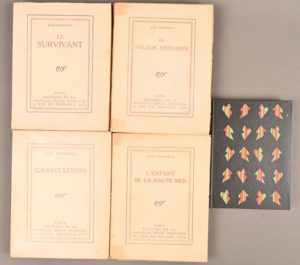 SUPERVIELLE Jules SUPERVIELLE Jules Réunion de 5 oeuvres en édition originale dont 4 réimposés de la NRF : - Gravitations Paris, NRF, 1925 In-4° tellière, broché. 1/109 sur vergé Lafuma-Navarre (n°LV). - Le Voleur d’enfants Paris, NRF, 1927 In-4° tellière, broché. Édition originale. 1/114 réimposés (n°XCII) - Le Survivant Paris, NRF, 1928. In-4° tellière, broché. Déchirure au dos. Édition originale. 1/110 réimposés (n°XCII) - L’Enfant de la haute mer Paris, NRF, 1930 In-4° tellière, broché. Dos décollé. Édition originale. 1/109 réimposés (n°XCIII) - Oublieuse Mémoire Paris, Gallimard, NRF, coll. Métamorphoses, 1949 In-12°. Cartonnage d’éditeur (maquette de Mario Prassinos) Édition originale. 1/750 sur Alfa.