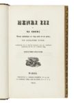 Alexandre DUMAS. Réunion de deux pièces de jeunesse. L’exceptionnel exemplaire de Mademoiselle George 2 ouvrages en un volume in-8, plein maroquin violet, grande plaque dorée et mosaïquées sur les plats portant au centre du premier plat le nom de « Mlle Georges », dos à nerfs orné d’un décor mosaïqué et doré, date dorée en pied, double filet sur les coupes, dentelle intérieure et tranches dorées, emboitage de chagrin marron postérieur (Reliure de Thouvenin). Henri III et sa cour ; Drame historique en cinq actes et en prose. Deuxième édition. Paris, Vezard et Cie, Le Normant Père, 1829. 171 pp. « J’ai fait cinquante drames depuis Henri III, aucun n’est plus savamment fait. » La pièce fut créée le 10 février 1829 à la Comédie-Française avec Mlle Mars dans le rôle de la duchesse de Guise, devant le duc d’Orléans venu aider au succès de celui qui était encore un de ses employés. Mêlant habilement amour et politique, Dumas, qui prend quelques libertés avec l’Histoire, raconte les sombres intrigues qui bouillonnaient à la cour d’Henri III : soucieuse de garder la réalité du pouvoir, Catherine de Médicis décide d’abattre Saint-Mégrin le favori du roi qui pourrait le convaincre de gouverner lui-même, ainsi que le duc de Guise, qui rêve d’être roi à la place du roi et, première étape, qui veut convaincre celui-ci de le nommer chef de la Ligue. L’intrigue se déroule les 20 et 21 juillet 1578. Le rideau s’ouvre sur l’inquiétant cabinet de l’astrologue de la reine, Ruggieri. Et le drame se met en place : Catherine s’arrange pour que le duc de Guise, mari fort jaloux, apprenne l’amour de Saint-Mégrin pour sa femme Catherine de Clèves. La pièce se déroule sur deux plans. Politique : Henri III, en se déclarant chef de la Ligue, se joue du duc de Guise. Amoureux : Guise prend sa revanche, avec la complicité forcée de sa femme, en attirant Saint-Mégrin dans un piège et en le faisant assassiner. Dumas, dans un style qui lui permettra de triompher sur scène pendant trente ans, exacerbe les passions de ses personnages, et n’hésite pas sur la représentation de la violence ce qu’interdisait absolument le théâtre classique : la scène au cours de laquelle Guise oblige sa femme à fixer par lettre un rendez-vous à Saint-Mégrin n’a guère d’équivalent par sa violence que celle où Othello tue Desdémone. Le public pantelant fit un triomphe au jeune dramaturge inconnu et Dumas devint célèbre du jour au lendemain. La pièce fut reprise de nombreuses fois durant tout le XIXe siècle. Munro, 10. Stockholm, Fontainebleau et Rome, Trilogie dramatique sur la vie de Christine. Cinq actes en vers, avec prologue et épilogue. Paris, Barba, 1830. [3] ff., 191 pp., frontispice dépliant d’après Raffet lithographié par Charlet. Édition originale. La pièce a été créée au théâtre de l’Odéon le 30 mars 1830 avec Mlle George dans le rôle de Christine de Suède, Lockroy dans celui de Monaldeschi et Alexandrine Noblet dans celui de Paula. Elle est dédiée au duc d’Orléans. Cette pièce fut inspirée à Dumas par une sculpture de Félicie de Fauveau exposée au Salon de 1827, Christine, reine de Suède, refusant de faire grâce à son grand écuyer Monaldeschi. La rédaction de la pièce avance vite mais sa création tardera, d’abord à cause du Théâtre-Français qui l’ayant reçue… l’enterre, ensuite à cause d’une censure soupçonneuse qui oblige Dumas à quelques aménagements. La pièce, jouée un peu plus d’un mois après Hernani, permet au public, adversaires et partisans du romantisme, d’en découdre une fois de plus. Frédéric Soulié, qui avait refusé sa collaboration à Dumas, rejoint la cohorte romantique accompagné de 50 ouvriers de la scierie qu’il dirige pour faire la claque. La première se déroule dans un tel tumulte qu’il est impossible de savoir si elle a réussi ou chuté. Vicaire III, 337-338 ; Talvart 7 ; Carteret, 224 ; Munro, 15. Des bibliothèques Ch. Bouret, Rahir, Robert Hoe, Régine et Bernard Loliée avec leurs ex-libris sur le contreplat. Précieux exemplaire de Mlle George créatrice du rôle de Christine de Suède qui, avec Mlle Mars, créatrice du rôle de la duchesse de Guise, domina la scène théâtrale pendant la première moitié du XIXe siècle. Magnifique reliure de Thouvenin, superbes provenances.