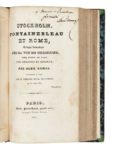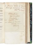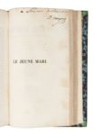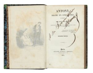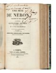 Alexandre DUMAS et autres. Théâtre. Recueil factice de 6 pièces. Un volume in-8, demi-veau bleu, dos lisse, titres dorés entre 3 fleurons et dans un grand encadrement de filet doré, chiffre doré en pied, tranches mouchetées (Reliure de Closs). Quelques pièces emblématiques du mouvement romantique – Alexandre DUMAS. Antony. Drame en cinq actes en prose. Deuxième édition. Paris, Auguste Auffray, 1832. [4] ff., 100 pp., [1] f., frontispice de Tony Johannot gravé par Thompson. Envoi : A mon bon ami Alcide. A. Dumas – Victor HUGO. Hernani ou L’Honneur castillan. Drame. Deuxième édition. Paris, Barba, 1830. [2] ff., VII pp., [1] p., 154 pp., frontispice dépliant de Raffet lithographié par Charlet. Envoi : A mon bon et cher ami Beauchêne. V.H. – Messieurs Alexandre SOUMET et Louis BELMONTET. Une fête de Néron. Tragédie en cinq actes. Paris, Barba, 1830. [2] ff., 120 pp., frontispice dépliant de Raffet lithographié par Charlet. Édition originale. Envoi autographe signé des deux auteurs : A Mr A. de Beauchêne hommage et souvenir d’amitié. L. Belmontet A. Soumet – Alex. DUMAS. Stockholm, Fontainebleau et Rome, Trilogie dramatique sur la vie de Christine. Cinq actes en vers, avec prologue et épilogue. Paris, Barba, 1830. [3] ff. (faux-titre, titre et dédicace), 191 pp., frontispice dépliant d’après Raffet lithographié par Charlet. Édition originale. Envoi autographe signé : A Monsieur de Beauchesne Fraternité A. Dumas - M. MAZÈRES. Le Jeune Mari, comédie en trois actes et en prose. Paris, Bezou, 1826. 72 pp. Édition originale. Envoi autographe signé : A son ami de Beauchesne Ed. Mazères – Alexandre de LONGPRÉ. Le Rendez-vous, esquisse de mœurs sous la Régence (1722.) En trois actes, en vers. Comédie. Paris, Amyot, 1831. viij, 100 pp. Édition originale. Envoi autographe signé : A Monsieur Alcide de Beauchesne. Hommage amical de l’auteur. Alexdre de Longpré. Relié en tête : Billet autographe signé pour 3 places dans une loge de galerie pour la représentation du 18 juillet 1831 au Théâtre Français. Alcide de Beauchesne (1804-1873), poète et historien, fut un des grands soutiens des romantiques lorsque, sous le règne de Charles X, il était chef de cabinet au département des Beaux-Arts. Dumas faillit se battre en duel avec lui pour une raison qu’il admit lui-même qu’elle était absurde et heureusement le duel n’eut pas lieu. Coiffes, mors et coins légèrement frottés rousseurs. Remarquable réunion de pièces représentatives du théâtre romantique, chacune portant un envoi à Alcide de Beauchêne ardent défenseur du jeune mouvement romantique, dans une reliure faite pour lui à son chiffre B dans lequel pousse un chêne.