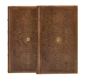 Alexandre DUMAS. Impressions de voyage. Paris, [Guyot pour le premier volume imprimé par H. Fournier – Charpentier pour le second volume, imprimé par Crété], 1834. 2 volumes in-8, plein veau chagriné lavallière, grande plaque à froid sur les plats dans un encadrement de filets dorés et à froid, au centre un médaillon portant le chiffre « LB » en caractères gothiques dorés, dos à nerfs ornés de fleurons à froid, de filets et de roulettes dorées, coupes ciselées, roulette intérieure et tranches dorées (Reliure de Koehler). [2] ff., 388 pp. ; [2] ff., 368 pp., titre-frontispice répété au second volume gravé à l’eau-forte par Célestin Nanteuil. Édition originale. Récit de son voyage en Suisse et en Italie du Nord effectué du 21 juillet aux environs du 20 octobre 1832. Dumas avait quitté Paris pour échapper à l’épidémie de choléra meurtrière qui sévissait dans la capitale. Impressions de voyage deviendra le titre générique de toutes les relations de voyage que Dumas donnera par la suite. « Dumas invente un genre, presque à son usage particulier. Un genre aux lois fantasques qui ne constitue pas une simple relation de voyage, mais intègre des écrits de genres différents ; chroniques historiques qu’expérimente par ailleurs l’écrivain, contes, traditions et légendes recueillis en route et mises dans la bouche de locuteurs, nouvelles contemporaines. Les Impressions de voyage apparaissent aujourd’hui comme le laboratoire de la prose narrative dumasienne. » (Schopp, Dictionnaire Dumas). Rien de convenu dans ce récit allègre qui appartient autant à la littérature de voyage qu’au genre romanesque, plein de bonne humeur et de fantaisie, dans lequel Dumas déverse son énergie débordante, sa curiosité des choses et des gens. Vicaire III, 341-342 ; Talvart, 17 ; Carteret, 228 ; Munro, 38-39. Magnifique frontispice de Célestin Nanteuil (1813-1873), illustrateur inspiré des romantiques, Hugo, Gautier, O’Neddy et Dumas à qui il donna encore les frontispices d’Angèle (voir n° 11 et 12), de Catherine Howard (n° 13 et 14), du Théâtre (n° 15). Exceptionnelle reliure de Koehler un des tout premiers, voire le premier, relieurs de son temps. Lors de sa première exposition en 1834 (année de l’édition de cet ouvrage) il reçut une médaille d’argent avec ce commentaire : « les reliures de M. Koehler sont au rang des plus belles qu’on connaisse en Europe… Ainsi dès son début il n’a pas de supérieur. » Nodier enfonça le clou en affirmant : « jamais le bon goût de la décoration, l’élégance et la pureté du dessin, le fini et la précision des dorures n’ont été poussés plus loin, et je serais fort surpris qu’il existât dans les bibliothèques de l’Europe vingt ouvrages d’art capables de contester la prééminence à celui qui, au moment où j’écris, enrichit probablement le cabinet d’un monarque ou d’un agent de change. » (cités par Fléty, p. 100). Le chiffre « L.B. » que l’on trouve en médaillon au centre des plats pourrait être celui du peintre Louis Boulanger (1806-1867), proche ami de Dumas qu’il accompagna notamment dans son voyage en Espagne. Petites restaurations aux coiffes, très légers frottements marginaux sur les plats et aux dos, quelques rousseurs pâles sans gravité au premier volume. Une des œuvres majeures de Dumas dans un exemplaire qui réunit un maître de la littérature romantique, un maître de l’illustration romantique et un maître de la reliure romantique !