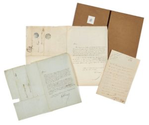 (Mademoiselle GEORGE). Ensemble de 3 Lettres autographes signées. 2 par Alexandre DUMAS, 1 par Alfred de VIGNY. Réunies dans une chemise à dos de maroquin fauve titré en long et un étui, in-8. De l’art d’amadouer une actrice Alexandre DUMAS, à Mademoiselle Georges, Boulevard St Martin n° 14, 1 p. in-8, s.d. [1837] Madame Je vous remercie d’avoir compris que les petites querelles d’intérêt ou d’art que je pouvais avoir avec Harel ne porteraient jamais atteinte à l’admiration que j’ai pour votre beau talent et à l’amitié bien réelle que j’ai pour votre personne. Les auteurs s’ils n’ont pas la mémoire du cœur ont au moins celle de l’amour propre ; et votre nom se trouve mêlé d’une manière si influente à une partie de mes succès que toutes les fois que je me souviens des uns il faut bien que je me rappelle l’autre. Je ne serai heureux et content, madame, qu’alors que j’aurai contribué d’une manière efficace, à la position élevée et stable qui vous convient au théâtre français ; d’ailleurs, mon intérêt personnel vous y réclame ; cependant, je vous avoue que j’aimerais mieux que vous crussiez à mon dévouement qu’à mon égoïsme. J’ai près de moi quelqu’un qui garde un trop bon souvenir des répétitions de la Chambre ardente et des représentations de Marie Tudor pour ne pas désirer aussi que ce bon tems revienne avec Caligula : Dieu le veuille. Croyez madame à l’assurance de mon amitié bien sincère et bien respectueuse. A. Dumas Alexandre DUMAS, à Mademoiselle Georges, Théâtre de la Porte St Martin Paris, 2 octobre 1837, 1 p. in-4, adresse au dos Madame Voilà cinq jours que je retarde ma distribution au milieu d’insistance bien naturelle de ma part pour vous avoir, puisque à côté de notre vieille amitié qui a survécu je l’espère à toutes les discussions d’intérêt où elle n’avait que faire, j’ai un besoin urgent de vous : mon rôle principal en passant par les mains d’un autre perdra tout son effet et je serai moi-même forcé de l’éteindre autant que possible. Je vous écris ces choses pour que vous ne croyez point à mon oubli. J’ai trop de mémoire, ou plutôt de reconnaissance pour permettre que mon silence soit attribué à une autre cause qu’à celle d’un provisoire qui me prend toutes mes minutes. Je baise avec la permission de qui de droit, la plus belle main de Paris A. Dumas Alfred de VIGNY. 1 p. in-8, 26 juin 1831 Voici le témoignage le plus passager du souvenir le plus durable possible, celui de votre belle création, Madame, et de cette surprenante transformation de votre talent dont j’ai eu le bonheur d’être la cause première. C’est un hasard dont je dois me féliciter et dont je ne conçois aucun orgueil car tout le mérite en est à vous-même et mon admiration vous est bien acquise comme mon entier dévouement. Alfred de Vigny La veille, Mlle George, avait créé au Théâtre de l’Odéon La Maréchale d’Ancre de Vigny. Intéressante correspondance de deux dramaturges à la grande star du théâtre de l’époque. Ex-libris : Régine et Bernard Loliée.
