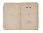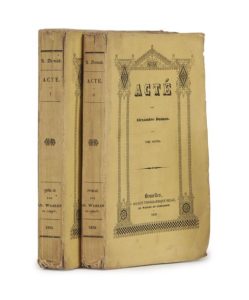 Alexandre DUMAS. Acté. Bruxelles, Société Typographique Belge, Adolphe Wahlen et Compagnie, 1838. 2 volumes in-12, brochés, couvertures jaunes imprimées, non rognés. 266 pp. ; 251 pp. Préfaçon belge. L'édition originale a paru l’année suivante chez Dumont. Le volume II se termine par une nouvelle supplémentaire : « Monseigneur Gaston Phoebus, chronique dans laquelle est racontée l'histoire du démon familier du sire de Corasse ». Après Caligula, Dumas s’attaque à un autre « monstre » romain, Néron, qu’il oppose comme dans l’ouvrage précédent, aux premiers chrétiens. En mai 57, Néron se rend sous un nom d’emprunt à Corinthe pour participer aux jeux néméens. Il retourne à Rome plusieurs fois vainqueur : il a remporté les trois titres des jeux et a ravi le cœur d’une jeune fille, Acté, qui le suit abandonnant son père et sa patrie. Ce n’est qu’une fois à Rome que la jeune fille s’apercevra que son amant n’est autre que Néron. Ayant appris de la bouche d’Agrippine les crimes de son amant, elle fuit et trouve refuge auprès de Paul. Dumas entraîne la jeune fille et ses lecteurs dans les catacombes, dans la fosse aux tigres, nous fait assister, après le meurtre d’Agrippine, à celui de Néron. Munro, 76. Taches sur la couverture avec manque angulaire au plat supérieur du premier volume, dos fendillés, rousseurs, mouillures, quelques feuillets brunis. Intéressant roman qui, après les Martyrs de Chateaubriand, met en scène les débuts du christianisme dans la Rome antique. Sienkiewicz s’inspira d’Acté pour écrire son best-seller Quo vadis ?
