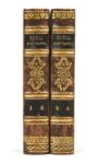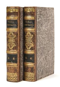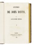 Alexandre DUMAS. Les Aventures de John Davys. Paris, Librairie de Dumont, 1840. 4 tomes en deux volumes in-8, demi-basane mouchetée à petits coins, dos à nerfs orné d’un gros fleuron et de roulettes dorées, pièces de titre et de tomaison noires, tranches jaunes (Reliure de l’époque). [2] ff., 322 pp. ; [2] ff., 321 pp. – [2] ff., 336 pp. ; [2] ff., 300 pp. Édition originale enregistrée dans la Bibliographie de la France les 1er février 1840 (tomes 1 et 2) et 7 mars (tomes 3 et 4). Le roman a d’abord paru en feuilleton dans la Revue de Paris du 30 juin au 19 novembre 1839. Un grand roman maritime qui se déroule dans les eaux turques un peu avant que les Grecs ne pensent à s’insurger. Fils de marin, élevé lui-même pour le devenir, John Davys, grand cœur, courageux et fidèle, est engagé à 17 ans. Il découvre la vie à bord, la fraternité de l’équipage mais aussi la cruauté de certains officiers envers les matelots. Vicaire III, 350-351 ; Talvart, 41 ; Munro, 90. Dos et mors frottés. Édition originale de toute rareté. L’exemplaire de la duchesse de Berry avec l’étiquette de sa bibliothèque au château de Brunsee sur le contreplat.