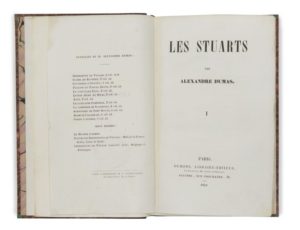 Alexandre DUMAS. Les Stuarts. Paris, Dumont, 1840. 2 volumes in-8, demi-maroquin prune à grain long, filet doré sur les plats, dos à nerfs ornés de fleurons et de roulettes dorées, date dorée en pied, non rogné, tampon ex-libris (Reliure de Stroobants). [2] ff., 308 pp. ; [2] ff., 304 pp. Édition originale. Cette chronique historique de la maison de Stuart couvre plus particulièrement la période 1437-1587 et se termine sur la mort de Marie Stuart. Vicaire III, 351 ; Talvart, 39 ; Carteret, 233 ; Munro 100. Dos passés, mors et coins légèrement frottés, réparations à quelques feuillets du premier volume, manques angulaires ou marginaux à quelques feuillets du second volume. Tampon de la librairie A. Rousseau à St-Lô « abonnement à la lecture ». Une édition originale rare. Bon exemplaire malgré les défauts signalés.