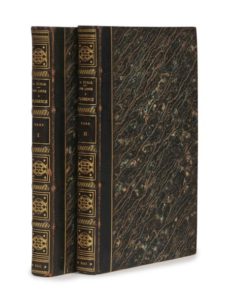Alexandre DUMAS. Une année à Florence. Paris, Dumont, 1841. 2 volumes in-8, demi-maroquin à grain long marine, filet doré sur les plats, dos à faux-nerfs ornés, couvertures jaunes imprimées et dos conservés, non rognés (Reliure de Stroobants). 340 pp., 343 pp. Édition originale. Le titre aurait pu être « Comment je me suis rendu à Florence ». Le volume commence à Marseille, là où se terminait Le Midi de la France, se poursuit par le séjour de Dumas à Toulon l’année suivante (1835) puis par le périple qui l’a mené de Toulon à Florence. Dumas flâne à travers la Provence, s’attarde à Nice avant de gagner Gênes, Livourne et enfin Florence. Toute la seconde moitié de l’ouvrage lui est consacrée. Elle se présente comme un fabuleux guide de la ville, et une fresque historique palpitante où Dumas nous entraine avec lui dans l’histoire mouvementée de la cité. Vicaire III, 352-353 ; Talvart, 47 ; Carteret, 233 ; Munro, 105. Mors frottés, infimes piqûres. Exemplaire à toutes marges de ce guide indispensable pour toute personne se rendant à Florence.