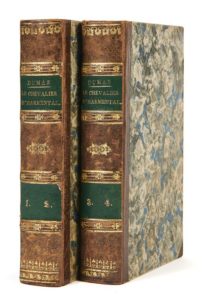 Alexandre DUMAS. Le Chevalier d’Harmental. Paris, Dumont, 1842. 4 tomes en 2 volumes in-8, demi-basane mouchetée à petits coins, dos à nerfs ornés, pièces de titre et de tomaison en maroquin vert, tranches jaunes (Reliure de l’époque). 326 pp., 305 pp. ; 340 pp., 337 pp. La rencontre de Dumas et d’Auguste Maquet et leur premier roman de cape et d’épée Édition originale. Ce roman est le développement et la transformation d’une nouvelle d’Auguste Maquet, le Bonhomme Buvat, présentée sans succès par l’auteur à la Presse. Il est à l’origine de la fameuse collaboration entre Dumas et Maquet. Le roman se passe au début de la Régence. Raoul d’Harmental, jeune provincial monté à Paris, déçu dans ses ambitions (son régiment est supprimé) et dans ses amours (le Régent lui souffle sa maîtresse) décide de se venger et entre dans la conspiration dite de Cellamare ourdie par la duchesse du Maine pour, avec l’aide de l’Espagne, prendre le contrôle du royaume. On le charge, rien de moins, d’enlever Philippe d’Orléans. Vicaire III, 355 ; Talvart, 53 ; Carteret, 234. Petits frottements aux dos, coiffes et coins, rousseurs éparses, quelques taches. Le premier roman réussi d’une décennie flamboyante qui verra la publication des grands romans de cape et d’épée de Dumas. L’exemplaire de la duchesse de Berry avec l’étiquette de sa bibliothèque au château de Brunsee sur les contreplats.