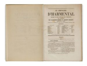 Alexandre DUMAS et Auguste MAQUET. Le Chevalier d’Harmental. Drame en cinq actes et dix tableaux, avec prologue. Musique de M. Varney. Paris, Alexandre Cadot, 1849. Grand in-8, pleine percaline chinée, pièces de titre en long en maroquin fauve, couvertures jaunes imprimées conservées, non rogné. 48 pp. Édition originale. La pièce fut créée le 26 juillet 1849 au Théâtre-Historique. Elle est tirée du roman éponyme publié en 1842 sous le seul nom de Dumas. Vicaire III, 355 ; Talvart 53 ; Munro, 218. Pièce de titre légèrement frottée, rousseurs et taches.