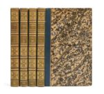 Alexandre DUMAS. Le Corricolo. Paris, Dolin, 1843. 4 volumes in-8, demi-veau bleu, filets dorés sur les plats, dos à faux-nerfs ornés, date dorée en pied, couvertures jaunes imprimées et dos conservés, non rognés (Reliure de Stroobants). [2] ff., 342 pp., [1] f. ; [2] ff., 327 pp., [1] p. ; [2] ff., 334 pp., [1] f. ; [2 ff.], 324 pp., [1] f. table et [1] f. blanc. Dumas et Naples : une histoire d’amour Édition originale. Quelle meilleure façon de visiter Naples, si on ne veut pas le faire à pied, que de prendre un corricolo, une sorte de tilbury à deux chevaux dont l’un tire et l’autre par ses folâtreries encourage le premier à tirer, si tant est que l’on sache les maîtriser. Sous ce titre Dumas a rassemblé les souvenirs de ses deux séjours à Naples en août et en novembre 1835. À ville trépidante, récit rapide et bouillonnant dans lequel les anecdotes s’enchaînent sans un moment de fléchissement. Dumas ne se déprendra jamais de Naples et la retrouvera en 1860 quand il participera à l’épopée garibaldienne. Vicaire III, 356 ; Talvart, 54 ; Munro, 122. Dos uniformément passés, coiffes, mors et coins légèrement frottés, quelques taches sur les couvertures du premier volume, rares rousseurs. « Un des récits les plus riches, drôles et attachants de la série des Impressions de voyage » (Noël Lebeaupin, www.dumaspere.com).