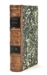 Alexandre DUMAS. George. Bruxelles et Leipzig, Méline, Cans et Compagnie, 1843. 2 tomes en un volume in-12, demi-basane fauve à petits coins, dos à nerfs orné d’un fleuron et de roulettes dorées, pièces de titre et de tomaison en maroquin noir, tranches jaunes (Reliure de l’époque). [2] ff., 305 pp. ; [2] ff., 262 pp. « Le seul roman de Dumas qui aborde de front la question raciale » (Claude Schopp) Préfaçon belge. L’histoire éditoriale du livre est embrouillée. Munro,126 pense, bien qu’il n’en ait pas retrouvé la trace, que le roman a d’abord paru en feuilleton et que les 4 éditions belges (celle-ci est la première) auraient été imprimées d’après ce feuilleton précédant ainsi l’édition originale parue à Paris chez Dumont la même année sous le titre Georges (avec un « s »). Le roman se passe à l’ile Maurice entre 1810 et 1824. Georges, fils d’un planteur métis, est envoyé par celui-ci à Paris pour faire son éducation. Parfaitement éduqué, plein d’honneur et de probité il retourne dans son île natale décidé à vaincre les préjugés auxquels il avait été confronté enfant du fait de sa condition de mulâtre. Coins un peu écrasés. Charmant exemplaire quasi-exempt de rousseurs de ce roman très rare dont le thème ambitieux rappelle que Dumas lui-même eut à souffrir des préjugés de race. L’exemplaire de la duchesse de Berry avec l’étiquette de sa bibliothèque au château de Brunsee sur le contreplat et le numéro d’inventaire sur le verso de la garde volante.
