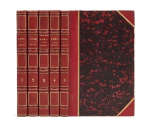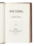 Alexandre DUMAS. Ascanio. Paris, Pétion, 1844. 5 volumes in-8, demi-maroquin à coins rouge, doubles filets dorés sur les plats, dos à nerfs ornés de doubles caissons et de filets dorés et à froid, tranches mouchetées (Reliure vers 1860). [2] ff., 329 pp. ; [2] ff., 334 pp., [1] f. ; [2] ff., 325 pp., [1] f. ; [2] ff., 294 pp., [1] f. ; [2] ff., 282 pp., [2] ff. Édition originale. Ce roman écrit en collaboration avec Paul Meurice est centré sur la personnalité de Benvenuto Cellini (dont les mémoires ont servi de trame) au moment où il arrive à la cour de France à l’invitation de François Ier. Ascanio son jeune apprenti l’accompagne. Le jeune homme y trouvera l’amour en la personne de la douce Colombe mais devra affronter les manœuvres et la jalousie de la duchesse d’Étampes, maîtresse du roi, qui est tombée amoureuse de lui… Cellini mettra tout en œuvre pour faire triompher l’amour des deux jeunes gens. Vicaire III, 358 ; Talvart, 60 ; Carteret, 235 ; Munro, 128. Menus frottements aux coiffes et aux coins, quelques coins écrasés, rares rousseurs, petits manques marginaux à quelques feuillets. Bel exemplaire dans une reliure quasiment contemporaine.