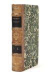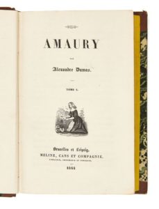 Alexandre DUMAS. Amaury. Bruxelles et Lepizg, Méline, Cans et Compagnie, 1844. 2 tomes en un volume in-12, demi-basane fauve à petits coins, dos à nerfs orné d’un fleuron et de roulettes dorées, pièces de titre et de tomaison en maroquin noir, tranches jaunes (Reliure de l’époque). [2] ff., 254 pp. ; [2] ff., 260 pp. Contrefaçon belge. Munro, 131. Coiffes légèrement frottées, coins supérieurs émoussés, très rares rousseurs. Charmant et précieux exemplaire de la duchesse de Berry avec l’étiquette de son château de Brunsee sur le contreplat et le numéro d’inventaire au verso de la garde volante.