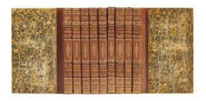 Alexandre DUMAS. Louis XIV et son siècle. Paris, Passard, 1845. 9 volumes in-8, demi-veau brun, dos à nerfs ornés, pièces de titre et de tomaison en maroquin fauve, date dorée en pied, couvertures et dos conservés, non rognés (Reliure de Franz). [2] ff., VIII, 304 pp., [1] f. (annonces), 2 pp. (annonces) ; [2] ff., 327 pp. ; [2] ff., 358 pp. ; [2] ff., 392 pp. ; [2] ff., 326 pp. ; [2] ff., 320 pp. ; [2] ff., 364 pp. ; [2] ff., 297 pp., 4 pp. (annonces) ; [2] ff., 308 pp., 4 pp. (annonces). Première édition non illustrée après l’originale parue en 1844-1845. Ambitieuse publication, très documentée, la première d’une longue série que Dumas continuera jusqu’au règne de Louis-Philippe. Vicaire III, 364-365 ; Carteret, 236 ; Munro, 160. Dos passés avec de légers frottements, déchirures et petits manques marginaux, quelques feuillets et couvertures réparés, rousseurs et taches. Cachet de cabinet de lecture de Mme Bouquerot sur le faux-titre du volume III.