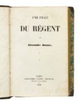 Alexandre DUMAS. Une fille du Régent. Paris, Cadot, 1845. 4 volumes in-8, demi-percaline à coins brune, étiquettes de titre collées au dos, tranches jaunes (Reliure de l’époque). [2] ff., 304 pp. ; [2] ff., 319 pp. ; [2] ff., 319 pp. ; [2] ff., 355 pp. Un des meilleurs romans historiques de Dumas Édition originale. Le roman se situe immédiatement après l’échec de la conspiration de Cellamare dont Dumas avait fait la toile de fond du Chevalier d’Harmental. Gaston de Chanlay est lui mêlé à la conspiration bretonne menée par le marquis de Pontcallec. Ordre lui a été donné de tuer le Régent dont il ignore qu’il est le père de la jeune fille qu’il aime Hélène de Chaverny. Les deux jeunes gens se trouvent au même moment à Paris, lui pour accomplir sa mission, elle appelée par son père. Les manigances du machiavélique cardinal Dubois qui manipule le Régent, feront leur malheur. Vicaire III, 369-370 ; Talvart, 73 ; Carteret, 236 ; Munro, 141. Dos décolorés en pied, coiffes et coins un peu écrasés, rousseurs éparses, petit manque marginal à un feuillet du premier volume. Cachet sec sur les titres : armes non identifiées et couronne de baron (allemandes). Cotes de bibliothèque au crayon bleu sur les gardes volantes. Exemplaire modeste d’un titre rare et palpitant de Dumas.
