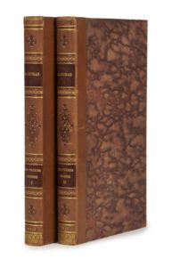 Alexandre DUMAS. Les Frères corses. Paris, Hippolyte Souverain, 1845. 2 volumes in-8, demi-veau fauve, dos à faux-nerfs ornés de fleurons à froid et de roulettes dorées, pièces de titre et de tomaison en maroquin lavallière, date dorée en pied, couvertures conservées, non rogné (Reliure de Canape). 302 pp., [1] f. (catalogue) ; 312 pp. L’encadrement de la couverture dessiné par E. Bourguignon est gravé par Cherrier. « Un roman destine à deux catégories de lecteurs : les corses et les autres » (Claude Schopp). Édition originale. La version remaniée d’Une famille corse (n° 76). Le roman est dédié à Mérimée à qui il emprunte l’épigraphe tirée de Colomba imprimée au-dessus de la dédicace. Deux jumeaux corses, qui ont suivi des trajectoires différentes, l’un vivant à Paris, l’autre n’ayant pas quitté son île et y respectant les traditions, sont restés unis par la télépathie. Mais la société mondaine parisienne n’a pas fait perdre à Louis le sens de l’honneur surtout quand une femme est outragée. Il sera tué en duel. Son frère, qui a ressenti dans sa chair la blessure mortelle, quittera la Corse pour le venger. Vicaire III, 371 ; Talvart, 76 ; Munro, 138. Infime accroc à la coiffe supérieure du second volume, légers frottements sur les plats et aux coins, petites réparations marginales à quelques feuillets, brunissure à deux feuillets du volume I, infimes rousseurs. Court, vivement mené et passionnant, un roman à découvrir. Bel exemplaire bien relié.