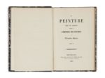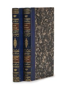 Alexandre DUMAS. La Peinture chez les Anciens. Suivie de L’Histoire des peintres. Bruxelles, Méline, Cans et Compagnie, 1845. 2 volumes in-12, demi-veau bleu, dos à nerfs orné, pièces de titre et de tomaison en maroquin fauve (Reliure de Franz). [2] ff., 252 pp. ; [2] ff., 284 pp. L’Histoire des peintres qui occupe la fin du premier volume et l’ensemble du second, est consacrée – Dürer, Cranach et Metzis exceptés – à la peinture italienne dont Dumas avait pu admirer nombre d’œuvres lors de son séjour d’un an à Florence où il avait hanté églises et musées. Petits frottements aux coiffes, infimes rousseurs.