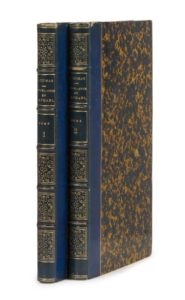 Alexandre DUMAS. Michel-Ange et Raphaël. Paris, Recoules, 1846. 2 volumes in-8, demi-maroquin bleu, filet doré sur les plats, dos à nerfs ornés, couvertures et dos conservés, non rognés (Reliure légèrement postérieure). [2] ff., 345 pp., [1] f. ; [2] ff., 306 pp., [1] f. 2ème édition, la première a paru en 1845 chez le même éditeur sous le titre plus complet de Michel-Ange et Raphaël Sanzio. Outre Michel-Ange et Raphaël, Dumas consacre un chapitre à André del Sarto, Jacques de Pontormo, Jean-Antoine Sogliani, Lippi, François Miéris, Guérard Berck-Heyden, Botticelli, Holbein, Ange Gaddi, le Primatice et Corneille Bega. Vicaire III 370-371. Dos légèrement pâlis, coiffes frottées, rousseurs souvent fortes. Exemplaire joliment relié.