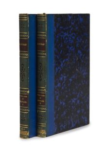Alexandre DUMAS. Michel-Ange et Raphaël. Paris, Recoules, 1846. 2 volumes in-8, demi-veau bleu, dos à faux-nerfs orné de fleurons à froid, de filets et de roulettes dorées, pièces de titre et de tomaison en maroquin fauve, couvertures et dos conservés, non rognés (Reliure de Canape). [2] ff., 345 pp., [1] f. ; [2] ff., 306 pp., [1] f. 2ème édition. Vicaire III 370-371. Dos passés, mors, coiffes et coins frottés, petites réparations aux couvertures, rares rousseurs.