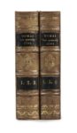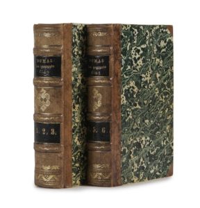 Alexandre DUMAS. Les Quarante-cinq. Bruxelles et Leipzig, C. Muquardt, 1847-1848. 6 tomes en 2 volumes in-32, demi-basane fauve à petits coins, dos à nerfs ornés d’un fleuron et de roulettes dorées, pièces de titre et de tomaison en maroquin noir, tranches dorées (Reliure de l’époque). [2] ff., 203 pp. ; [2] ff., 201 pp. ; [2] ff., 205 pp. – [2] ff., 190 pp. ; [2] ff., 197 pp. ; [2] ff., 158 pp. Contrefaçon belge. L’édition originale a paru chez Cadot en 1847-1848. Maquet collabora au roman qui est la suite et la fin de la Dame de Montsoreau. Il se déroule entre octobre 1582 et juin 1584 et l’on retrouve Chicot, le bouffon d’Henri III, cherchant encore et toujours à déjouer les intrigues des Guises contre le roi. Dumas lui donne un rôle central dans le roman. Diane de Méridor, elle, cherchera à se venger du duc d’Anjou qui a fait tuer son amant Bussy d’Amboise. Les Quarante-cinq eux sont une troupe de gentilshommes gascons rassemblés par le duc d’Épernon pour servir de garde rapprochée au roi. Munro, 191. Dos pâlis, dorure un peu ternie, coiffes et coins frottés, rares rousseurs et taches. Précieux exemplaire de la duchesse de Berry avec l’étiquette de sa bibliothèque au château de Brunsee.