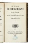 Alexandre DUMAS. Le Vicomte de Bragelonne. ou Dix ans plus tard, suite des Trois Mousquetaires et de Vingt ans après. Paris, Michel Lévy Frères, 1848-1850. 26 volumes in-8, demi-veau vert bronze, dos lisses ornés de roulettes et de filets dorés (Reliure légèrement postérieure). [2] ff., 322 pp., [1] f. ; 326 pp., [1] f. ; [2] ff., 326 pp., [1] f. ; [2] ff., 308 pp., [1] f. ; [2] ff., 323 pp., [1] p. ; [2] ff., 318 pp., [1] f. ; [2] ff., 317 pp., [1] f. ; [2] ff., 311 pp., [1] p. ; [2] ff., 306 pp., [1] f. ; 319 pp., [1] p. ; [2] ff., 317 pp., [1] f. ; [2] ff., 301 pp., [1] f. ; [2] ff., 318 pp., [1] f. ; [2] ff., 311 pp., [1] p. ; [2] ff., 305 pp., [1] f. ; 327 pp., [1] p. ; [2] ff., 305 pp., [1] f. ; 317 pp., [1] f. ; [2] ff., 307 pp., [1] p. ; 299 pp., [1] f. ; [2] ff., 307 pp., [1] p. ; [2] ff., 305 pp., [1] f. ; [2] ff., 300 pp., [1] f. ; [2] ff., 277 pp., [1] f. ; [2] ff., 275 pp., [1] f. ; [2] ff., 292 pp., [1] f. Le roman le plus touchant de la trilogie des Mousquetaires Édition originale. Roman écrit en collaboration avec Auguste Maquet. Dix ans après… Le roman débute en 1659 par la visite de Louis XIV à Blois. En Angleterre comme en France, la jeunesse prend le pouvoir : Charles II monte sur le trône d’Angleterre en 1660, Mazarin meurt en 1661 laissant un Louis XIV décidé à régner seul… et qui ne va pas tarder à faire arrêter Fouquet son surintendant, un des grands épisodes du roman. Les quatre amis, comme dans Vingt ans après vont se retrouver mais curieusement deux ou trois à la fois, jamais quatre, Aramis, tenu à l’œil par d’Artagnan, jouant sa propre partie, mentant, se dérobant, manipulant un Porthos aveuglé par son amitié. Riche de quatre intrigues qui auraient pu constituer chacune un roman séparé, le Vicomte de Bragelonne, quoique le plus touchant – l’amour sans retour de Bragelonne pour Louise de La Vallière qui ne vit que pour le roi, la mort exemplaire d’Athos, de Porthos et de d’Artagnan – est le mal aimé de la trilogie. Il a trouvé un défenseur en Roger Caillois dans sa longue réponse au questionnaire de Raymond Queneau pour son ouvrage une Bibliothèque idéale : « Sous une rubrique ‘divertissement’, j’ai rangé le Vicomte de Bragelonne que je relis périodiquement, avec un plaisir toujours accru et que je crois parfois un grand roman, infiniment supérieur en tout cas à tous les autres volumes du même auteur et en particulier à ceux de la même série. » Vicaire III, 381-383 ; Talvart, 93 A ; Carteret, 239 ; Munro, 195. Dos uniformément passés, très petits frottements aux coiffes et aux coins, rousseurs et taches éparses, petites réparations à quelques rares feuillets. Rare édition originale de la fin des aventures des mousquetaires.