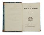 Alexandre DUMAS. Les Mille et un fantômes. Bruxelles, Alph. Lebègue, 1849. 6 tomes en 2 volumes in-32, demi-basane fauve à petits coins, dos lisses ornés, pièces de titre en maroquin fauve, tranches jaunes (Reliure de l’époque). 160 pp., 157 pp., 161 pp. ; 156 pp., 145 pp., 182 pp., 2 pp. (catalogue). Une œuvre fameuse dans la littérature terrifiante Une contrefaçon (il en existe trois) devenue rare tout autant que l’originale. Celle-ci bien qu’imprimée après l’originale française (parue la même année à Paris chez Cadot) reprend néanmoins le texte du feuilleton du Constitutionnel. Ces récits fantastiques ont été écrits en collaboration avec Paul Lacroix (le Bibliophile Jacob). Cette édition comprend en plus « Un dîner chez Rossini », « Les Gentilshommes de la Sierra Morena », « les Mariages du Père Olifus », « Le Testament de M. de Chauvelin » et « l’Arsenal ». Lors d’un dîner auquel participe Dumas chaque convive est invité à raconter une histoire terrifiante, de mort violente et de survie après la mort. Chacun y va de bon cœur et les contes s’enchaînent comportant tout ce qui se trouvait d’horrible dans les littératures anglaises et allemandes : morts animés, revenants, décapités, crimes atroces, vampires même avec « les monts Carpathes », où on assiste à la lutte fratricide entre deux frères dont l’un est un vampire pour l’amour d’une même femme. Talvart, 96 ; Munro, 211. Dos pâlis, dos et coins frottés, quelques rousseurs sans gravité. Fantômes et vampires, une incursion rare de Dumas dans la littérature fantastique. Précieux exemplaire de la duchesse de Berry avec l’étiquette de la bibliothèque de son château de Brunsee.