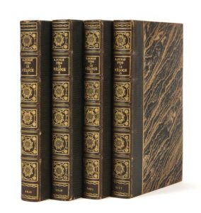 Alexandre DUMAS. Le Véloce ou Tanger, Alger et Tunis. Bruxelles, Meline, Cans et Compagnie, 1849-1851. 4 volumes in 12, demi-maroquin à grain long vert bronze, filet doré sur les plats, dos à nerfs richement ornés, couvertures et dos conservés, non rognés (Reliure de Strrobants). [2] ff., 295 p. ; [2] ff., 284 p. ; [2] ff., 267 p. ; [2] ff., 304 p. Contrefaçon belge. L’édition originale a paru à Paris chez Cadot. Un autre volume des Impressions de voyage de Dumas qui fait suite à De Paris à Cadix. Le Véloce est le nom de la corvette mise à la disposition de Dumas par Salvandy, ministre de l’Instruction publique, qui lui avait demandé de traverser la Méditerranée pour écrire ses impressions sur l’Algérie afin de faire connaître ce pays aux Français et de populariser ainsi sa colonisation afin qu’industriels et colons s’y précipitent. Le voyage eut lieu de la fin novembre 1846 au début janvier 1847. Le Véloce portait très mal son nom et si « c’était un beau et brave bâtiment […] se comportant à merveille par un gros temps, sachant, grâce à l’expérience de son équipage, se tirer d’un mauvais pas, […] il avait une chaudière trop petite pour sa taille, un mouvement trop faible pour sa corpulence ; enfin, ce n’était aucunement la faute du Véloce s’il était mauvais marcheur. » Tout mauvais marcheur qu’il était, il emmena Dumas d’abord au Maroc, puis toujours vaillant jusqu’en Tunisie pour terminer en Algérie. Cette mission ne fut pas du goût de tout le monde, et au retour de Dumas, lors d’une séance houleuse à la Chambre, des explications furent demandées au gouvernement pour avoir chargé un « entrepreneur de feuilletons » d’une mission officielle. Le récit prend la forme de lettres adressées à une dame. Dumas s’attache à décrire les beautés des pays qu’il découvre, recueille de nombreuses anecdotes locales, revient sur la récente conquête d’Alger par les Français, se livre à une étude « anthropologique » des différentes populations locales. Écrivant une œuvre de propagande, Dumas oublie qu’il a été un défenseur de la liberté des peuples, et si son livre intéresse encore aujourd’hui, c’est comme un témoignage du regard des Français sur leur droit de conquête. Munro, 201. Dos uniformément passés, quelques très légers frottements aux coiffes et aux coins, petit manque au premier plat de couverture du volume 4 réparé, quelques rousseurs. Sinon bel exemplaire. Dumas dans un rôle inattendu, celui de propagandiste de la politique coloniale française.