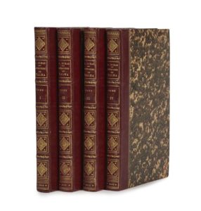 J.-F. TALMA. Mémoires. écrits par lui-même. Et recueillis et mis en ordre sur les papiers de sa famille par Alexandre Dumas. Paris, Hippolyte Souverain, 1849-1850. 4 volumes in-8, demi-maroquin bordeaux, filet doré sur les plats, dos à faux-nerfs richement ornés, date dorée en pied, non rognés (Reliure de Stroobants). 314 pp., [1] f. blanc ; 297 pp. ; 316 pp. ; 315 pp. Édition originale. Les Mémoires sont précédés d’ « Un Mot » de Dumas dans lequel il explique les circonstances qui l’ont mis en possession des papiers de Talma, et l’intérêt de ces mémoires : « En art, nul homme en France, n’a été si près de la perfection que Talma. En politique, peu d’hommes ont vu ce qu’il a vu […] En littérature, il avait tout lu, tout étudié, tout compris […] Toute grandeur s’est approchée de lui, ou l’a rapproché d’elle. » L’illustre tragédien, qui exerça une influence considérable sur le renouvellement du théâtre en France – diction, gestuelle, costume – eut également une influence considérable sur Dumas. Si l’on en croit celui-ci il n’aurait effectué son premier voyage à Paris que pour voir deux personnes, son ami Adolphe de Leuven et Talma. Présenté à Talma celui-ci l’aurait adoubé : « Je te baptise poète au nom de Shakespeare, de Corneille et de Schiller ! […] Retourne en province, rentre dans ton étude, et, si tu as véritablement la vocation, l’ange de la Poésie saura bien aller te chercher où tu seras. » Vicaire III, 387 ; Talvart, 101 ; Munro, 223. Dos du 3e volume et coiffes légèrement frottées, couvertures et quelques feuillets réparés, rares rousseurs, petit trou n’affectant pas le texte à un feuillet du volume 4. Importants Mémoires indispensables à la connaissance du théâtre au début du XIXe siècle.