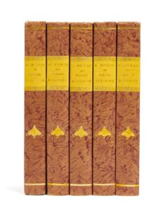 Alexandre DUMAS. Mémoires d’un médecin. Joseph Balsamo. Paris, Michel Lévy Frères, 1850. 5 volumes in-18, cartonnage de papier à la colle, pièce de titre et de tomaison en veau citron, couvertures et dos conservés (Reliure postérieure). [2] ff., 317 pp., [1] f. ; [2] ff., 323 pp., [1] p. ; [2] ff., 331 pp., [1] p. ; [2 ff.], 350 pp., [1 p.] ; [2] ff., 334 pp., [1] f. L’édition originale a été publiée en 1846-1849. Le premier roman d’une tétralogie qui se poursuivra avec Le Collier de la Reine, Ange Pitou et La Comtesse de Charny. Joseph Balsamo se déroule sur quatre ans, de l’arrivée de Marie-Antoinette en France en mai 1770 à la mort de Louis XV en mai 1774. Sévit à Paris à ce moment-là un inquiétant personnage, Joseph Balsamo, véritable nom du comte de Cagliostro, aux pouvoirs extraordinaires et aux desseins ténébreux dont le but secret est la destruction de la monarchie. La cour de Versailles a aussi son compte d’intrigues autour de la personne du roi entre le clan de sa maîtresse Mme du Barry et celui de son ministre Choiseul, et de passions amoureuses. Cette série, après celle des Mousquetaires, est une des plus justement célèbres de Dumas et a été constamment rééditée. Munro, 185. Dos pâlis, rousseurs et mouillures.