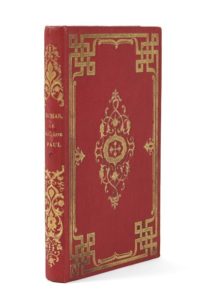 Alexandre DUMAS. Le Capitaine Paul. Paris, Michel Lévy Frères, 1850. In-12, percaline rouge à large décor doré sur les plats et le dos, chiffre doré sur le second plat « P.d.O. », tranches dorées (Reliure de l’époque). [2] ff., 285 pp. L’édition originale a paru en 1838. Albert Dauzats a collaboré à l’ouvrage. La lecture du Pilote « l’un des plus magnifiques romans de Cooper » donna à Dumas l’envie d’en savoir plus sur son héros le capitaine Paul Jones et il partit en quête de renseignements notamment dans les ports français où il avait mouillé. « Il me vint alors dans la pensée que ce que j’avais ressenti d’intérêt et d’impatience en lisant le roman de Cooper, d’autres l’avaient ressenti comme moi […] et j’ai écrit cette histoire. » Vicaire III, 347 ; Talvart, 27 ; Munro, 74. Petit accroc au dos. Charmant exemplaire très frais.