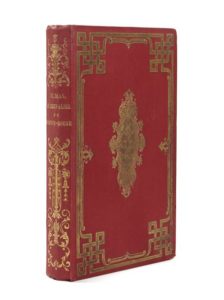 Alexandre DUMAS. Le Chevalier de Maison-Rouge. Paris, Michel Lévy Frères, 1850. In-18, percaline rouge à large décor doré sur les plats et le dos, chiffre doré sur le second plat « P.d.O. », tranches dorées (Reliure de l’époque). [2] ff., 406 pp. L’édition originale a été publiée chez Cadot en 1845-1846. Auguste Maquet collabora à ce roman, l’un des plus célèbres que les deux hommes consacrèrent à l’époque révolutionnaire. Il couvre la terrible période qui va de mars 1793 (Marie-Antoinette emprisonnée à la prison du temple attend l’ouverture de son procès) à l’exécution de la reine en octobre. Il raconte les efforts désespérés du chevalier de Maison-Rouge, un des fervents de la Reine, pour la sauver. Munro, 174. Quelques filets dorés un peu ternis sur les plats, mors supérieur élimé sur quelques millimètres au niveau de la coiffe, un coin émoussé, les autres légèrement frottés, très rares rousseurs. Bon exemplaire malgré ces petits défauts.