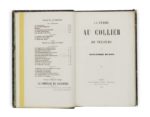 Alexandre DUMAS. La Femme au collier de velours. Paris, Cadot, 1851. 2 volumes in-8, demi-maroquin vert à grain long, dos à nerfs ornés, date dorée en pied, couvertures et dos conservés, non rognés (Reliure de Stroobants). [2] ff., 326 pp., [1] f. ; [2] ff., 333 pp., [1] f. Le sous-titre pourrait être : la morte amoureuse Édition originale (1850) avec nouvelles pages de titre et couvertures à la date de 1851. C’est la dernière histoire fantastique qui appartient à la série des Mille et un fantômes. Elle débute par une évocation émue de Nodier et de l’Arsenal où « tout mourut, joie, vie et lumière » le jour du décès Nodier. Celui-ci aurait raconté l’histoire à Dumas. Elle met en scène E.T.H. Hoffman, l’auteur des contes fantastiques, venu à Paris en mai 1793. Dans ce Paris de la Terreur, la guillotine est partout, même au cou des femmes. Elle sert ainsi de fermoir au collier de velours que porte la maîtresse de Danton qu’Hoffman, oubliant la promesse faite à sa fiancée Antonia de lui être fidèle et de ne pas jouer, décide de conquérir. Pour cela il lui faut de l’or… Il joue, gagne et… à partir de là le fantastique macabre des Mille et un fantômes joue à plein. Vicaire III, 387-388 ; Talvart, 102 ; Munro, 217. Menus frottements, aux coiffes, aux mors et aux coins, rares rousseurs. Bel exemplaire de ce roman terrifiant qui évoque le souvenir de Nodier.
