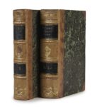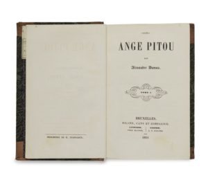 Alexandre DUMAS. Ange Pitou. Bruxelles, Méline, Cans et Compagnie, 1851. 5 tomes en 2 volumes in-12, demi-veau à petits coins fauve, dos à faux-nerfs ornés, pièces noires, tranches jaunes (Reliure de l’époque). [2] ff., 255 pp. ; [2] ff., 270 pp. – [2] ff., 254 pp. ; [2] ff., 255 pp. ; [2] ff., 157 pp. Édition belge parue en même temps que l’édition originale à Paris chez Cadot. Ange Pitou est la suite de Joseph Balsamo et du Collier de la Reine. Le roman débute en 1789 juste avant la prise de la Bastille. Pitou, un jeune paysan venu de Villers-Cotterêts (lieu de naissance de Dumas), participera à l’attaque de la forteresse. Dorure un peu ternie, coins écrasés, rousseurs éparses. Munro, 236. Précieux exemplaire de la duchesse de Berry avec l’étiquette de sa bibliothèque au château de Brunsee.