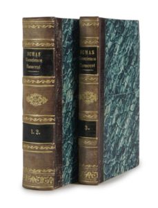 Alexandre DUMAS. Conscience l’innocent. Bruxelles, Méline, Cans et Cie, 1852. 3 tomes en deux volumes in-12, demi-maroquin aubergine à grain long, petits coins, dos à nerfs ornés, pièces en maroquin noir, tranches jaunes (Reliure de l’époque). [2] ff., 294 pp. ; [2] ff., 268 pp. ; [2] ff., 269 pp. Édition originale parue en même temps que l’édition française chez Cadot sous le titre Conscience. En tête l’éditeur a inséré une lettre de Dumas lui indiquant qu’il aura la seule édition complète pour l’étranger de ce roman, comme Cadot l’aura pour la France. L’ouvrage avait paru en feuilleton dans le Pays, avec des modifications pour cause de censure de tous les passages relatifs à Napoléon. Dumas ajoute cette petite pique en direction des contrefacteurs : « Il en résulte que, comme vos confrères reproducteurs, pour arriver à temps, seront obligés de reproduire d’après le journal, – et non d’après l’édition de librairie de Cadot, qu’ils n’auront pas la patience d’attendre, votre édition à vous sera la seule conforme à l’édition de librairie parisienne. Je déclare donc que toute autre édition que l’édition de librairie de Paris et la vôtre sont des éditions tronquées. » Dumas précise enfin que le nom du héros est un « hommage fraternel rendu par moi à l’un de vos auteurs flamands les plus distingués, M. Henri Conscience, auquel j’ai emprunté, avec sa permission bien entendu, deux charmants chapitres de son roman le conscrit. » Un des romans écrits par Dumas alors que, succombant sous les dettes, il s’était exilé à Bruxelles. Nostalgie de la France ? Il le situe dans le petit village d’Haramont près de Villers-Cotterêts, le lieu de son enfance, à un moment où Napoléon ayant besoin de troupes fraîches, la conscription s’intensifie. Munro, 243. Dos uniformément passés, petits frottements, légères rousseurs. L’exemplaire de la duchesse de Berry avec l’étiquette et le numéro d’inventaire de sa bibliothèque au château de Brunsee.