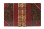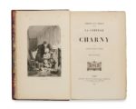 Alexandre DUMAS. Mémoires d’un médecin. La Comtesse de Charny. Paris, Dufour, Mulat et Boulanger, 1858. 2 volumes grand in-8, demi-maroquin à coins rouge, double filet doré sur les plats, dos à 5 nerfs ornés de doubles caissons à encadrement de volutes, portant au centre un bonnet phrygien au bout d’une pique et du laurier, têtes dorées, date dorée en pied, couvertures conservées ainsi que partie du dos du second volume, têtes dorées, non rognés (Reliure de Marius Magnin). [2] ff., 544 pp. (2 ff. intervertis) ; [2] ff., 636 pp ; 64 planches gravées hors texte (32 par volume) de Philippoteaux, Pisan, Pouget. Réimpression de l’édition parue en 1856 chez le même éditeur, mêmes format, pagination et illustrations. Petit défaut à la coiffe supérieure du second volume, coins très légèrement frottés, couvertures usées, faux-titres et derniers feuillets roussis, rousseurs éparses. Rare édition illustrée très bien reliée par Magnin.