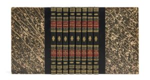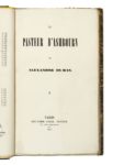 Alexandre DUMAS. Le Pasteur d’Ashbourn. Paris, Alexandre Cadot, 1853. 8 volumes in-8, demi-veau noir, dos à nerfs ornés de fleurons et de roulettes dorées, pièces de titre et de tomaison en maroquin rouge, date dorée en pied, , couvertures jaunes imprimées et dos conservés, non rognés (Reliure de Franz). [2] ff., 297 pp., [1] f., [1]f (catalogue) ; [2] ff., 315 pp., [1] f., [1 f.] (catalogue) ; [2] ff., 307 pp., [1] p. ; [2] ff., 328 pp., [1] f., [1] f. (catalogue) ; [2] ff., 318 pp., [1] f. ; [2] ff., 302 pp., [1] f. ; [2] ff., 317 pp., [1] f. ; [2] ff., 302 pp., [1] f. Édition originale. Une œuvre curieuse et peu commune. Le roman se passe dans le pays de Galles au XVIIIe siècle. Il comporte quelques chapitres qui tiennent du roman noir ou du roman fantastique : Le Pays de Galles, la Chambre murée, Pendant la nuit, Pendant le jour, la Fièvre jaune, sont ainsi peuplés d’hallucinations et de spectres. Vicaire III, 398-399 ; Talvart, 121 ; Carteret, 241 ; Munro, 261 ; Loliée, Romans noirs, 171. Menu manque angulaire à une pièce de tomaison, réparation marginale à quelques feuillets des volumes 3, 4 et 8. Bel exemplaire d’un titre peu connu de Dumas. Très rare.