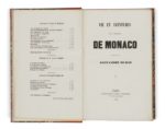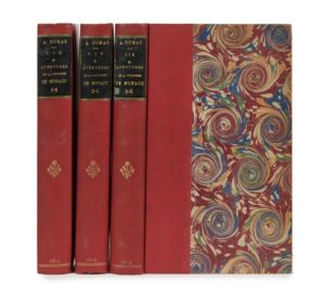 Alexandre DUMAS. Vie et aventures de la princesse de Monaco recueillies par Alexandre Dumas. Paris, Alexandre Cadot, 1854-1857. 6 tomes en 3 volumes in-8, demi-percaline rouge, fleuron et date dorés au dos, pièces en maroquin vert foncé, couvertures conservées (Reliure de la fin du XIXe siècle). [2] ff., 317 pp., [1] f., 310 pp., [1] f. – [2] ff., 309 pp., [1] f. ; [2] ff., 301 pp., [1] f. – [2] ff., 300 pp., [1] f. table, [1] f. annonces ; [2] ff., 319 pp., [1] p. Édition originale, avec pages de titre et couvertures de remise en vente à la date de 1857 pour les volumes 3 à 6. En 1793, les monégasques eux aussi se piquèrent de faire la Révolution, déclarèrent qu’ils étaient en République et s’en allèrent piller le château du prince Honoré IV. L’un d’eux découvrit dans la bibliothèque 5 petits volumes manuscrits qu’il emporta et qui restèrent dans sa famille. Son petit-fils les aurait confiés à Dumas comme seul capable d’en tirer quelque chose. Dumas qui allait commencer d’écrire Louis XIV et son siècle, se serait amusé de la coïncidence qui mettait entre ses mains les mémoires d’une des femmes les plus scandaleuses du Grand Siècle. Il s’agit en fait d’une biographie romancée dont Dumas tira la matière de la documentation qu’il avait rassemblée sur le règne de Louis XIV et il écrivit cette histoire en collaboration avec la comtesse Dash spécialiste des romans historiques. Catherine-Charlotte de Gramont (1639-1678) épouse de Louis Ier de Monaco, mena à la cour de Louis XIV et à Monaco une vie mouvementée, participant aux intrigues de la cour, cocufiant son mari avec le duc de Lauzun et sans doute beaucoup d’autres. Munro, 276. Petits défauts aux coiffes, épidermures superficielles aux pièces de titre, coins légèrement frottés, rousseurs éparses. Bon exemplaire de ces pseudo-mémoires hautement romanesques.