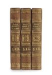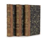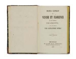ANQUETIL. Bianca Capello. ou Venise et Florence au XVIe siècle. Avec une préface par Alexandre Dumas. Bruxelles, Ch. Vanderauwera, 1853. 6 tomes en trois volumes in-16, demi-basane fauve à petits coins, dos à nerfs orné d’un fleuron, de grecques et de roulettes dorées, tranches jaunes (Reliure de l’époque). [2] ff., XXIV, 133 pp., [1] f. blanc ; [2] ff., 167 pp. – [2] ff., 155 pp. ; [2] ff., 164 pp. – [2] ff., 165 pp., [2] ff., 149 pp. L’édition originale a paru la même année toujours à Bruxelles en 6 volumes. L’existence mouvementée de Bianca Capello (1548-1587) – Vénitienne, maîtresse puis épouse duc François Ier de Médicis et qui mourut quelques heures après lui sans doute empoisonnée à l’arsenic – ne pouvait qu’intéresser Dumas qui prétend avoir voulu lui consacrer un roman. Mais pour ce faire, il lui fallait voir les lieux de sa jeunesse, Venise, où la police autrichienne lui interdit toujours de pénétrer. Il renonça donc au roman mais ne renonça pas tout à fait au sujet et donna une préface au livre d’Anquetil. Munro, 363. Dos très légèrement pâlis, petits frottements aux coins, rares rousseurs. Rare. Charmant exemplaire de la duchesse de Berry sans l’étiquette ni le numéro d’inventaire de sa bibliothèque au château de Brunsee.