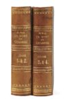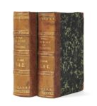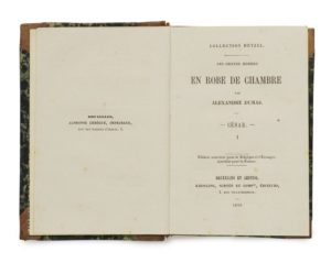 Alexandre DUMAS. Les Grands Hommes en robe de chambre. César. Bruxelles et Leipzig, Kiessling, Schnée et Compie, « Collection Hetzel », 1855. 4 tomes en 2 volumes in-32, demi-basane fauve à petits coins, dos à nerfs ornés de grecques et de roulettes dorées, tranches jaunes (Reliure de l’époque). 204 pp., 202 pp., 204 pp., 212 pp. Édition originale « autorisée pour la Belgique et l’étranger, interdite pour la France ». Imprimée par Lebègue, elle a paru également sous le seul nom de celui-ci. La première édition française a paru l’année suivante chez Cadot. Le premier volume d’une série consacrée à quelques hommes célèbres et le retour de Dumas à l’Antiquité. Dumas reprend ici la formule qu’il a adoptée dans ses récits historiques d’instruire en amusant. Talvart, 140, Vicaire II, 719 et III, 407 ; Munro, 287. Dos pâlis avec petites taches sans gravité, rousseurs éparses, petit manque marginal à un feuillet du premier volume. L’exemplaire de la duchesse de Berry sans l’étiquette ni le numéro d’inventaire de la bibliothèque de son château de Brunsee.