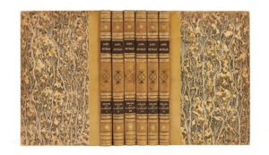 Alexandre DUMAS. Pèlerinage de Hadji-abd-el-Hamid Bey. Médine et La Mecque. Publié par Alexandre Dumas. Paris, Alexandre Cadot, 1856-1858. 6 volumes in-8, demi-veau havane clair, dos à nerfs ornés, pièces de titre et de tomaison en maroquin chocolat, date dorée en pied, couvertures imprimées et dos conservés (la couverture du premier volume porte simplement « Collection Cadot pour Cabinet de lecture »), non rognés (Reliure de Franz). [2] ff., VIII, 325 pp., [1] f. ; [2] ff., 319 pp., [1] p. ; [2] ff., 314 pp., [1] f. ; [2] ff., 299 pp., [1] p. ; [2] ff., 317 pp., [1] f. ; [2] ff., 323 pp., [1] p. Édition originale. Elle comporte des chapitres supplémentaires par rapport à la publication dans le Mousquetaire. Il faut noter que cet ouvrage n’est pas inclus dans l’édition Lévy des Œuvres complètes. Abd-el-Hamid se nommait en fait Louis du Couret (1812-1867), fils d’un colonel qui avait fait la campagne d’Égypte avec le père de Dumas. Il partit courir le Moyen-Orient dès 1834, se convertit à l’islam et fit le Hadj avant de traverser l’Arabie entre 1844 et 1845. Pas plus qu’il n’était allé au Sinaï, Dumas n’alla à Médine ou à La Mecque, et il se contente d’un voyage à travers les notes de Du Couret qu’il met en forme, enrichit et auxquelles il donne vie. Comme nombre de ses contemporains, Dumas regardait du côté de l’Orient, les yeux, le cœur et l’imagination remplis de visions fantasmées dont il régala ses lecteurs avides de sensations exotiques. Vicaire III, 409 ; Talvart, 146 ; Munro, 289. Menus frottements sans aucune gravité aux coiffes et aux coins, infimes piqûres. Bel exemplaire de ce très rare récit de voyage en Orient auquel Dumas a prêté sa plume flamboyante.