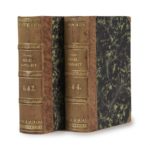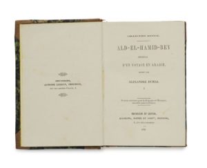 Alexandre DUMAS. Abd-el-Hamid Bey, journal d’un voyage en Arabie. rédigé par Alexandre Dumas. Bruxelles et Leipzig, Kiessling, Schnée et Compie, 1856 (Collection Hetzel). 4 tomes en 2 volumes in-32, demi-basane fauve à coins, dos à nerfs ornés de grecques, roulettes et filets dorés, tranches jaunes (Reliure de l’époque). 199 pp., [1] p. ; 198 pp., [1] f. ; 200 pp., [1] p. ; 211 pp., [1] p. « Édition autorisée pour la Belgique et l’étranger, interdite pour la France ». Elle a paru la même année que l’originale parisienne chez Cadot. Vicaire III, 409 ; Talvart, 146 ; Munro, 289. Dos pâlis, coiffes et coins légèrement frottés, rousseurs. L’exemplaire de la duchesse de Berry sans l’étiquette ni le numéro d’inventaire de sa bibliothèque au château de Brunsee.