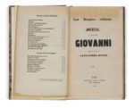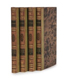 Alexandre DUMAS. Taïti – Marquises – Californie. Journal de Madame Giovanni. rédigé et publié par Alexandre Dumas. Paris, Alexandre Cadot, 1856. 4 volumes in-8, demi-veau vert olive, dos à faux-nerfs ornés de fleurons, de roulettes et de filets dorés et à froid, pièces de titre et de tomaison en maroquin brun, date dorée en pied, couvertures imprimées et dos conservés, non rognés (Reliure de Canape). [2] ff., 318 pp., [1] f. ; [2] ff., 310 pp., [1] f. ; [2] ff., 318 pp., [1] f. ; [2] ff., 311 pp., [1] p. Les aventures d’une déportée dans les îles du Pacifique Première édition française. L’édition originale a paru à Bruxelles en 1855 dans la « Collection Hetzel » sous le titre Marie Giovanni, journal de voyage d’une Parisienne, rédigé par Alexandre Dumas. Qui était Marie Giovanni ? le mystère a été percé par Douglas Wilkie (son article paru en 2013 a été traduit en français par Isabelle Safa dans les Cahiers Alexandre Dumas, n° 42, 2022) qui a démontré qu’il s’agissait de Louisa Callegari, une personnalité tout à fait fascinante. Condamnée à Londres en 1841 à un an de prison pour escroquerie, elle reprend ses activités aussitôt sortie de prison et, en 1842, est condamnée dix ans de déportation. On comprend pourquoi, au début de son récit elle indique ne pas vouloir être connue sous son vrai nom « il y aurait pour moi certains inconvénients de famille à le livrer à la publicité. Cette publicité, d’ailleurs, donnée à un nom de femme, à un nom de mère, ne me permettraient peut-être pas toujours d’être aussi vraie que je veux l’être. Ceux qui m’ont connue me reconnaîtront donc facilement, malgré le pseudonyme que j’adopte. » Écrit sans grand souci de la chronologie (Wilkie pense que Dumas a volontairement bâti son récit en évitant les repères trop clairs afin de rendre l’identification de la narratrice impossible), le récit est néanmoins précis, même dans les moindres détails de la couleur locale : Papeete, les populations locales, la reine Pomaré à qui elle rend visite. Elle y rencontre également le peintre Charles Giraud qui rentra en France en 1847. Vicaire III, 406 ; Munro, 285 ; O’Reilly, 1113-1116. Dos uniformément passés, petit accroc à la coiffe supérieure du 3e volume, les autres coiffes légèrement frottées, réparations aux titres, celui du tome 3 entièrement doublé, très rares rousseurs et déchirures. Excellent récit écrit par Dumas sur les notes d’une ancienne déportée !