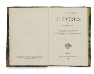 Alexandre DUMAS. Causeries. Leipzig, Alph. Durr, « collection Hetzel », 1857. In-32, demi-basane fauve à petits coins, dos lisse orné de grecques et de roulettes dorées, pièce de titre en maroquin blond, tranches jaunes (Reliure de l’époque). 221 pp., [1] f. Le premier de quatre volumes de « causeries » que Dumas publiera dans la collection Hetzel. « Dans tous les pays du monde, on parle, on pérore, on discute ; on ne cause qu'en France. La causerie est une condition de notre langue bavarde, une conséquence de notre caractère bon enfant. » Dumas invente avec ces « causeries » un genre journalistiques nouveau qui permet au lecteur de se croire en compagnie de l’écrivain au coin de son feu. Ce volume contient : « Les trois dames » ou les conquêtes de son fils Alexandre ; « Rois du lundi », référence aux Lundis de Sainte Beuve et où il est question bien sûr des critiques littéraires ; « Une chasse aux éléphants » ; « L’homme d’expérience » ; « Les étoiles commis voyageurs » ; et le très émouvant texte sur « la dernière année de Marie Dorval ». Vicaire II, 720-721 ; Munro, 277. Rousseurs sur les premiers et les derniers feuillets. Charmant exemplaire qui provient de la bibliothèque de la duchesse de Berry à Brunsee mais sans l’étiquette ni le numéro d’inventaire.