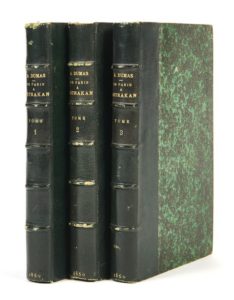 Alexandre DUMAS. De Paris à Astrakan. Nouvelles impressions de voyage. Première, deuxième et troisième série. Paris, Librairie Nouvelle, A. Bourdillat et Ce, 1860. 3 volumes in-18, demi-basane verte, dos à 5 nerfs, date dorée en pied, couvertures conservées, non rognés. [2] ff., 318 pp., [1] f. ; [2] ff., 313 pp., [1] f. ; [2] ff., 306 pp., [1] f. Première édition française. L’édition originale des deux premières séries a été publiée à Bruxelles chez Méline et Cans en 1858. Vicaire III, 418 ; Talvart 164 B, qui ne décrivent que les deux premières séries ; Munro, 322. Coiffes nerfs et coins frottés, quelques rousseurs principalement au volume 2 dont le papier est un peu bruni. Bon exemplaire néanmoins.