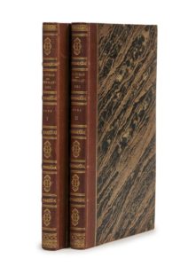 Alexandre DUMAS. Ammalat-Beg. Paris, Alexandre Cadot, s.d. [1859]. 2 volumes in-8, demi-maroquin à grain long fauve, filet doré sur les plats, dos à faux-nerfs ornés de fleurons et de roulettes dorés, non rognés (Reliure de Stroobants). [2] ff., 336 pp., [1] f. ; [2] ff., 351 pp., [1] p. Première édition française. L’originale a paru la même année à Bruxelles dans la « collection Hetzel ». Le roman est la réécriture d’une nouvelle retrouvée après sa mort dans les papiers de Bestuchef-Marlinsky. Situé dans les années 1828, c’est « un curieux tableau de la guerre, telle qu’elle se fait entre les Russes, ces représentants de la civilisation du Nord, et les sauvages et féroces habitants du Caucase. » Le premier chapitre porte en exergue « Sois lent à l’offense et prompt à la vengeance », une inscription gravée sur les poignards du Daghestan. Le roman sera republié en 1862 sous le titre Sultanetta. Talvart, 170 B ; Munro, 320. Dos passés, mors légèrement frottés, réparations aux premiers feuillets du tome I, rares rousseurs. Cachet de libraire « Rousseau à St-Lô » qui proposait également un « abonnement de lecture ». Exemplaire décoratif, à toutes marges.